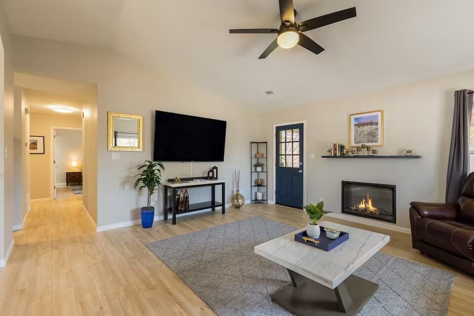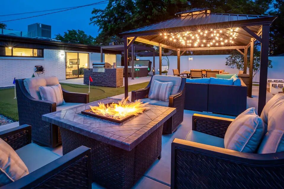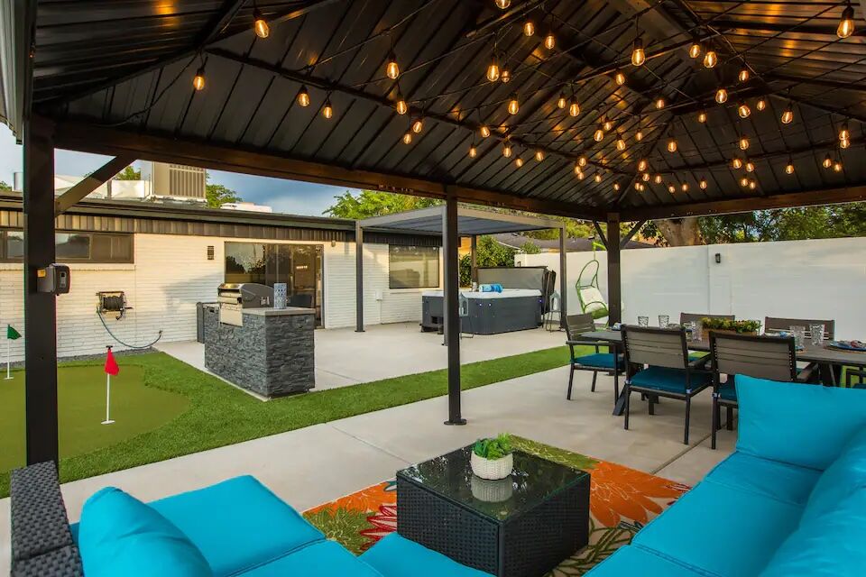 See more photos This three-bedroom home puts you within walking distance of shops and restaurants, while still giving you quick access to I-40 for getting across the city. Old Town, the Sandia Peak Tram, and hiking trails are all just a short drive away. The house itself has been fully redone, with updated finishes and a layout that works well for a group or family. Most of the action, though, is out back: there’s a hot tub, a fire table with lounge seating, an outdoor kitchen, and a dining setup that makes it easy to spend entire evenings outside. Add in a putting green and space for games like cornhole, and it feels set up for long, relaxed hangouts. Indoors, you’ve got a mix of entertainment options including a foosball table, a retro-style arcade machine, and a large smart TV, along with a kitchen stocked for actual cooking rather than just the basics.