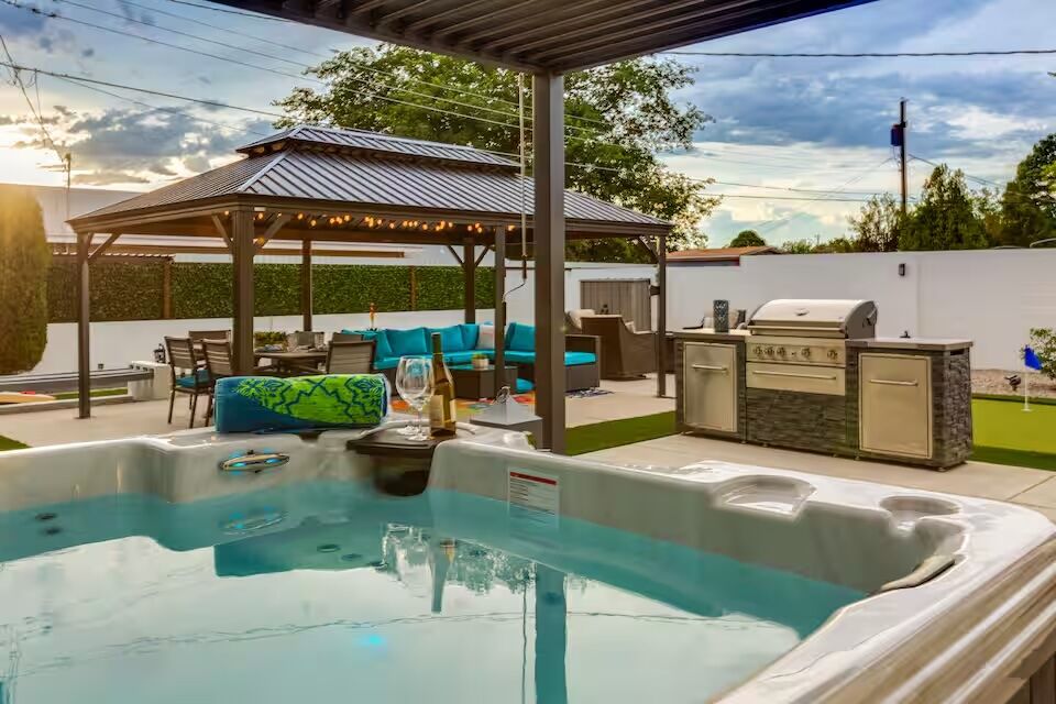 See more photos New to the market, this Airbnb Albuquerque with a hot tub, yard games, and a fire pit is perfect for small groups and families. Besides the cheerful backyard, the immaculately furnished property has an indoor games room for chillier fall and winter nights. The Uptown neighborhood is convenient for Old Town, Balloon Fiesta, and the mountains.