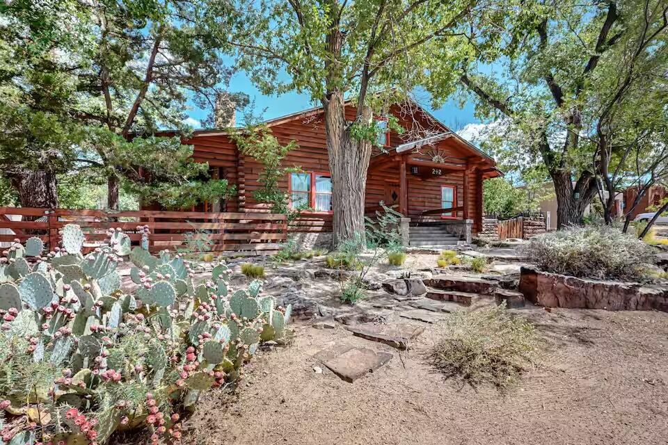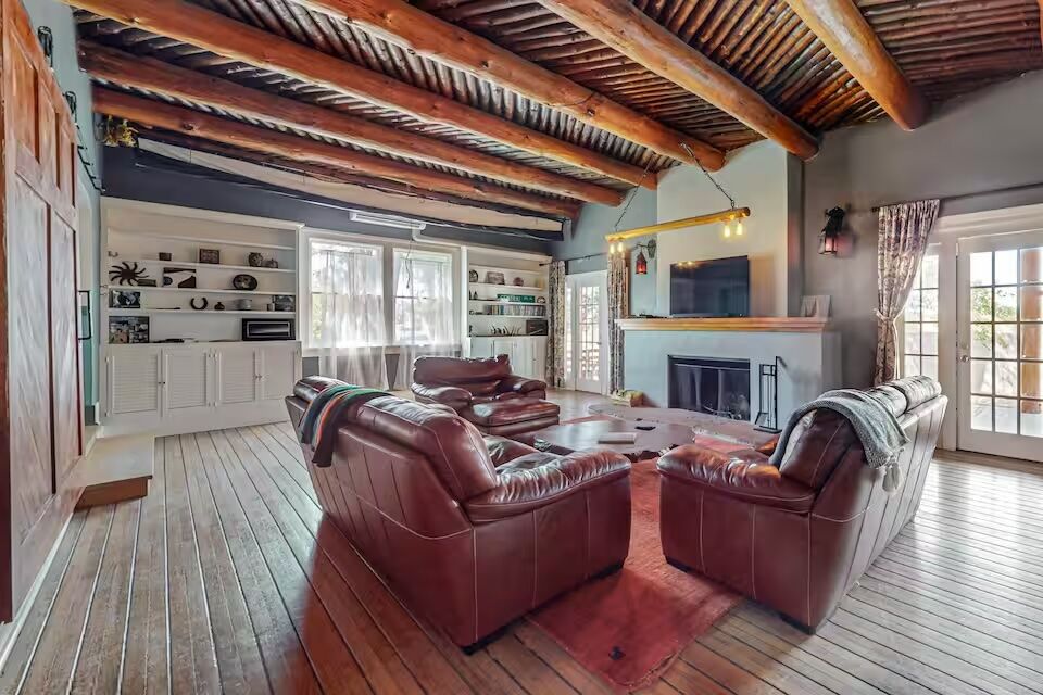 See more photos A short walk from the center of Nob Hill, this 1927 log cabin feels like a piece of Albuquerque’s early history that you can actually spend time in. Built by one of the neighborhood’s original developers using whole logs from the Jemez Mountains, the house still carries that sense of craftsmanship—especially in the main living space, where massive vintage vigas stretch across the ceiling above leather seating and a large TV. With more than 4,000 square feet, there’s plenty of room to settle in, whether that’s in one of the four bedrooms (two kings, two queens) or in the extra nooks like the upstairs loft, which looks out toward the Sandia Mountains and doubles as a quiet spot to read or write.